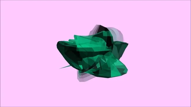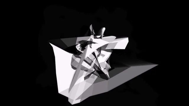 A strand of code reads an audio file while simultaneously generating a 3-D object. The 3-D objects shape is random for the most part but does spike in size and direction based off of the volume and inflection of the audio file given.