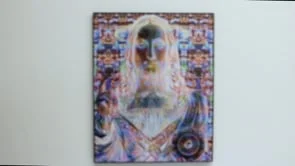 I take archetypical, religious ideals to generate images. I filter these concepts through a hyperdigital aesthetic lens driving the viewer to question the work and its intention. There is an element of the work that may seem ostentatious or antagonistic in relationship to the iconography used. This dance between possible antagonism and superfluous exaltation, seriousness and absurdity begs the viewer to question the integrity and meaning of the work. The art in turn invites the viewer to question their own relationship to the iconography and concepts at play.